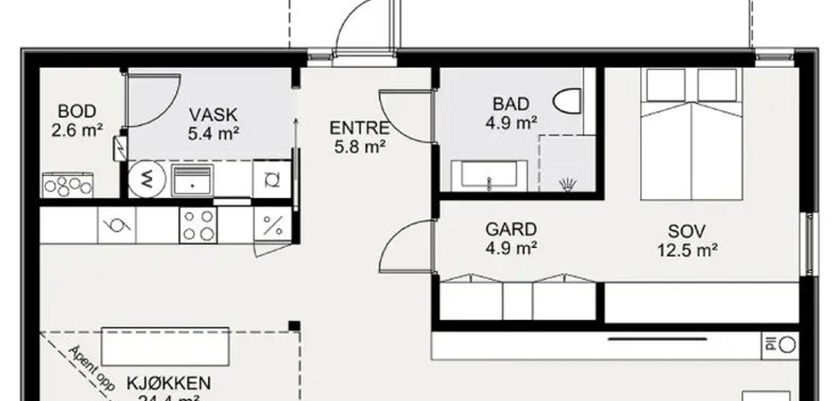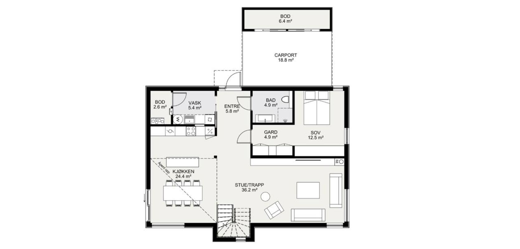 Første etasje rommer et stort kjøkken med rikelig plass til spisestue, samt en stor adskilt stue. Fra allrommet går du via et walk-in-closet til hovedsoverommet. I etasjen er det også et bad, et vaskerom og en bod.