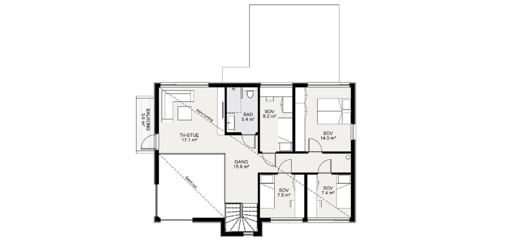 Over spisesonen er det åpent opp til andre etasje, slik at takhøyden blir ekstra stor. Dette, sammen med de store vinduene i hjørnet, gjør at rommet skiller seg ut og blir lyst og åpent. I andre etasjen er det fire soverom, et allrom og et bad. Etasjen har mønet himling, som gir huset et flott særpreg og det føles luftig. Her er det også utgang til en balkong. Selv om huset har saltak, får det en moderne stil. Her kombineres ulike materialer og detaljer.