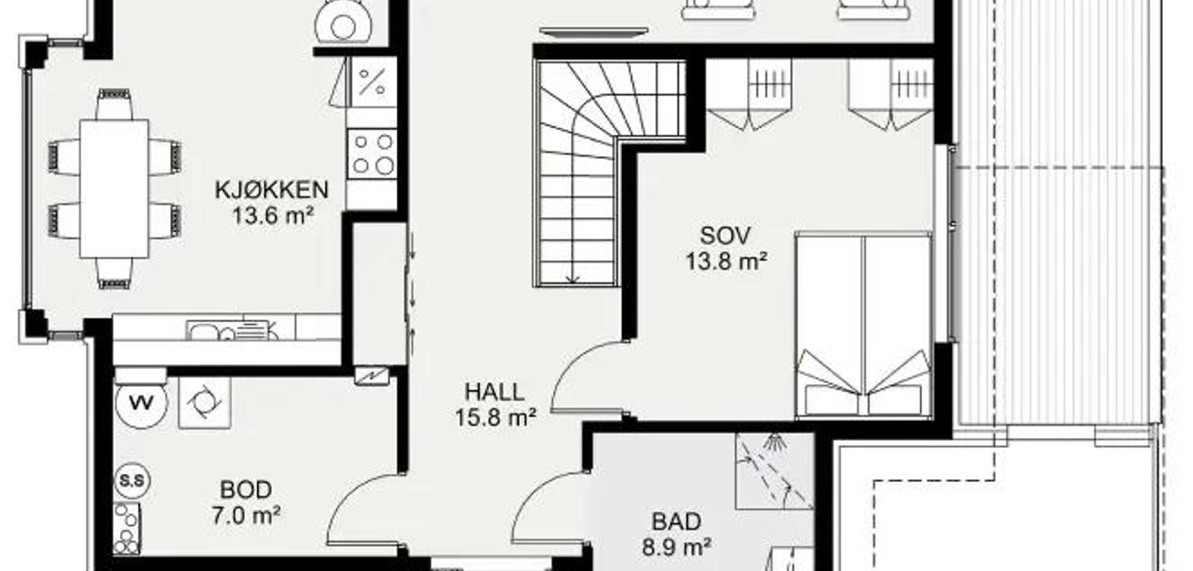 Signatur 306 er tilpasset skrå tomt, og hovedinngangen ligger på øvre plan, med kort vei til carporten. Rett ved siden av inngangen har du direkte adkomst til en utvendig sportsbod. Huset har også en stor, flott terrasse tilgjengelig fra stuen.
