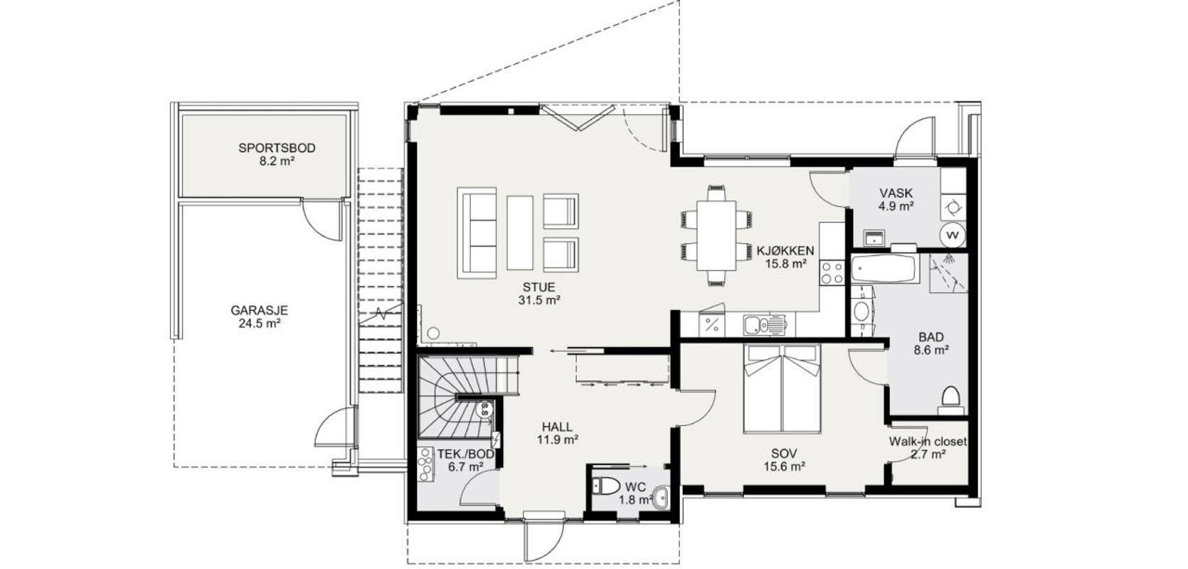 Huset har en integrert carport på den ene siden, som er kombinert med en stor, deilig terrasse. En trapp gir enkel adkomst til terrassen. I tilknytning til carporten finner du også en sportsbod som gir deg god lagringsplass for bildekk, ski, sykler og annet utstyr.