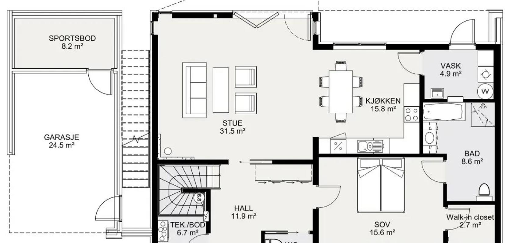 Med et bruksareal på 205 kvadratmeter, inkludert carport og sportsbod, tilbyr boligen alt du trenger for å leve komfortabelt. Fire soverom, eget walk-in-closet, to bad, vaskerom, stor loftstue og en flott uteterrasse over carporten gir deg plass til å leve drømmelivet. Den praktiske plasseringen av alle hovedfunksjonene på ett plan gjør dette huset også attraktivt for alle livsfaser.