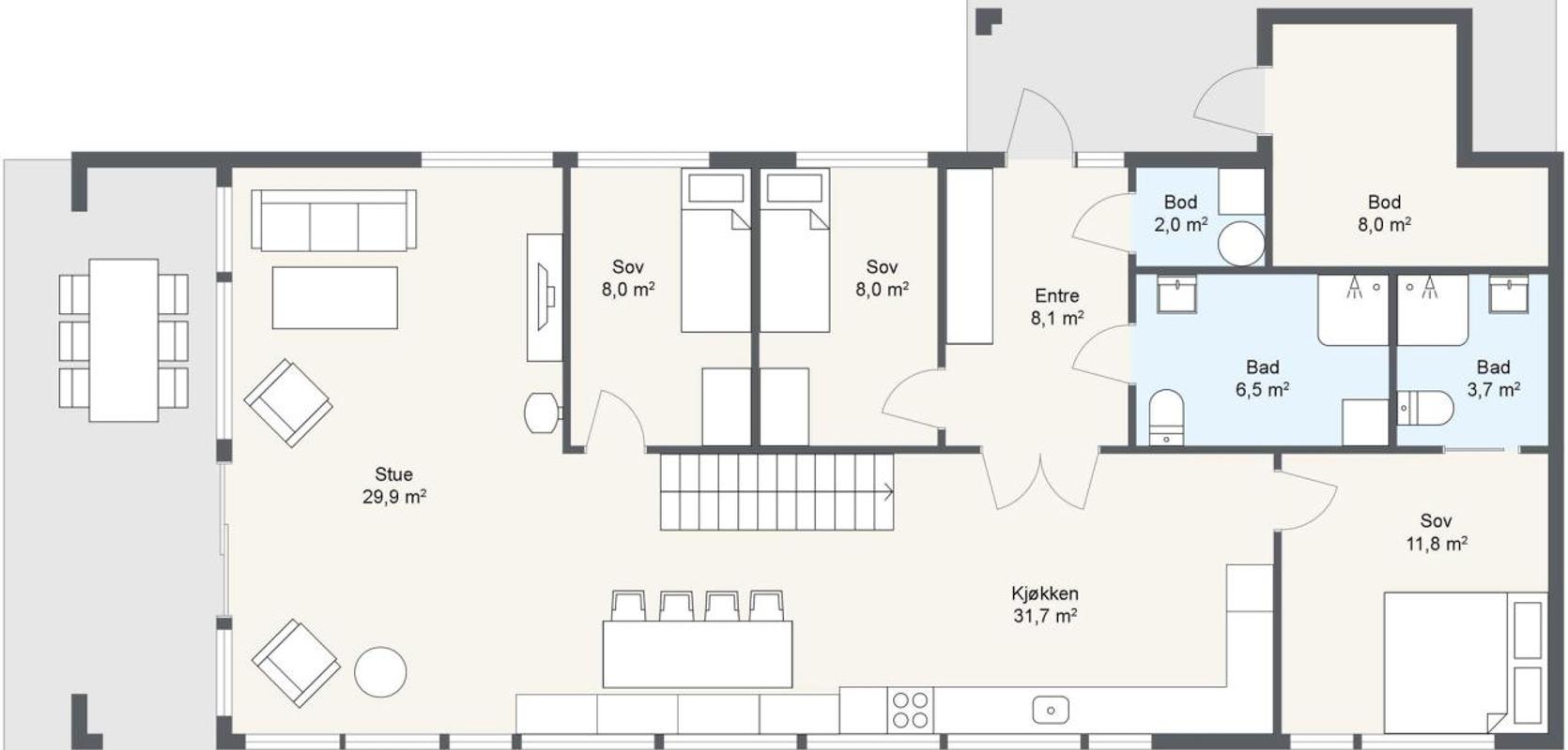 Oppholdsrom med sosiale soner og overbygd terrasse