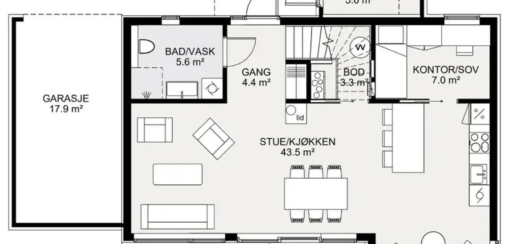 Inngangspartiet har et praktisk overbygg som inkluderer en romslig sportsbod. Et perfekt sted for oppbevaring av alt fra sykler og ski til hageutstyr. Går du inn i huset kommer du først til et vindfang med garderobe. Deretter ledes du inn i det store, åpne oppholdsrommet som har kombinert stue- og kjøkkenløsning. Fra spiseplassen har du flott utsyn gjennom store vindusflater.