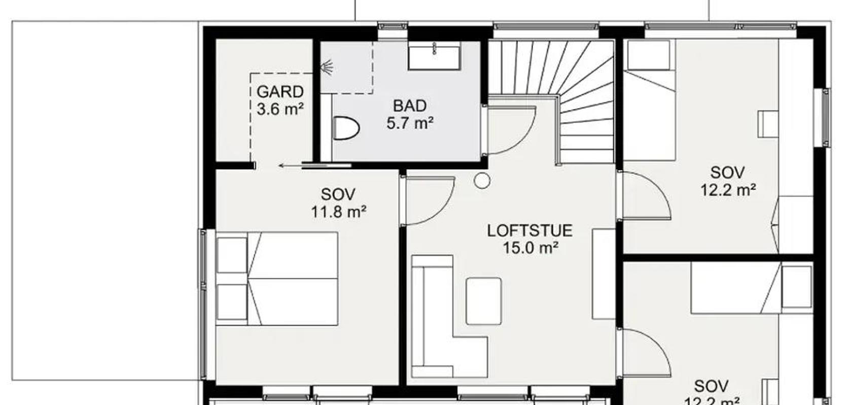 I andre etasje finner du tre romslige soverom, hvorav ett har walk-in-closet og direkte utgang til balkongen. Her er det også en trivelig loftstue med utgang til balkong og et bad med vindu.