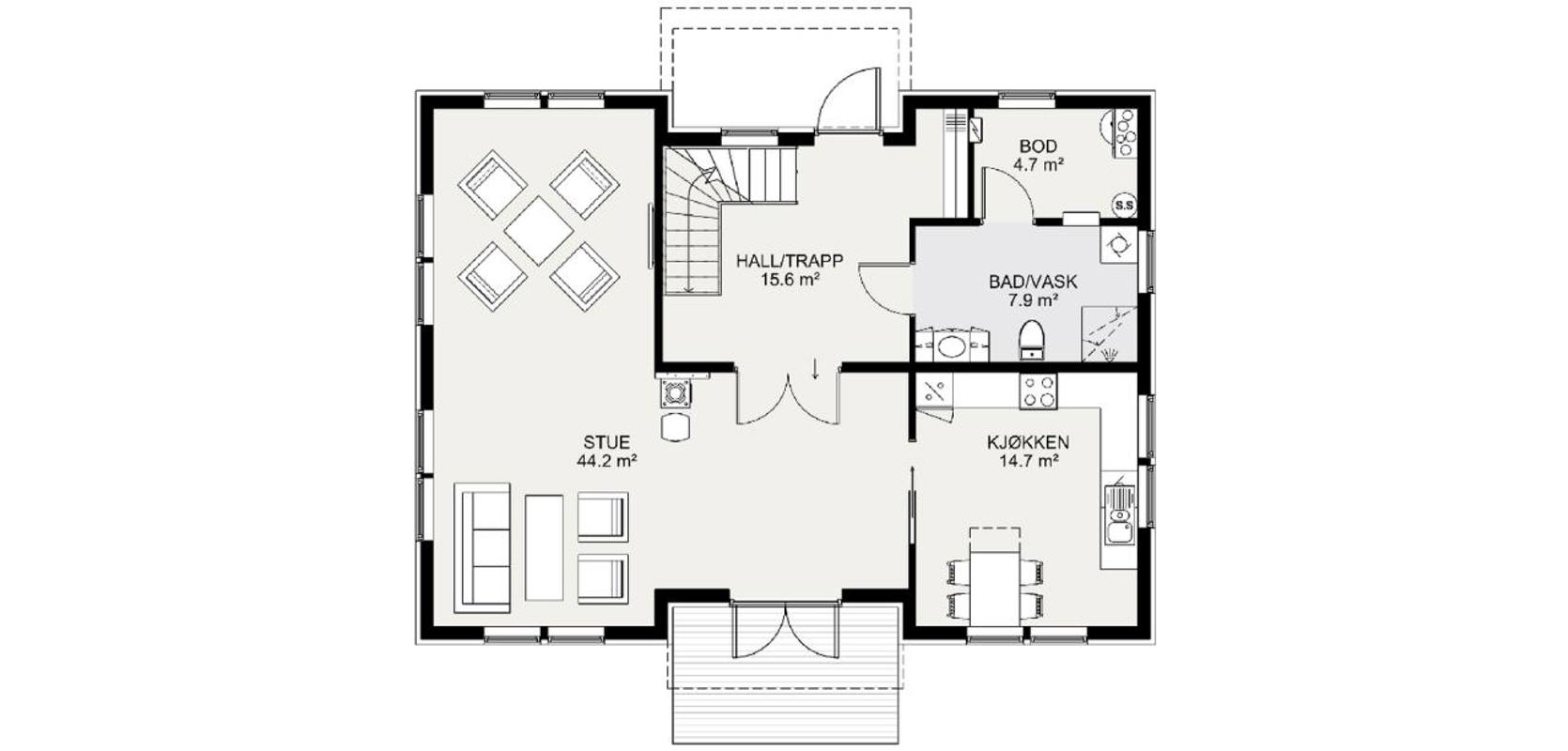 Det overbygde inngangspartiet fører deg inn i første etasje og til en romslig hall. Her finner du et kombinert bad og vaskerom med en tilhørende bod, og en dobbeltdør som fører deg videre inn i den store stuen. Stuen har to koselige soner, hvorav den ene kan brukes som en TV-stue eller enkelt omgjøres til et ekstra soverom ved behov. Kjøkkenet er avskjermet med en skyvedør og ligger i kort avstand fra stuen. Fra stuen kan du også enkelt gå ut i hagen, som innbyr til hyppig bruk om sommeren.