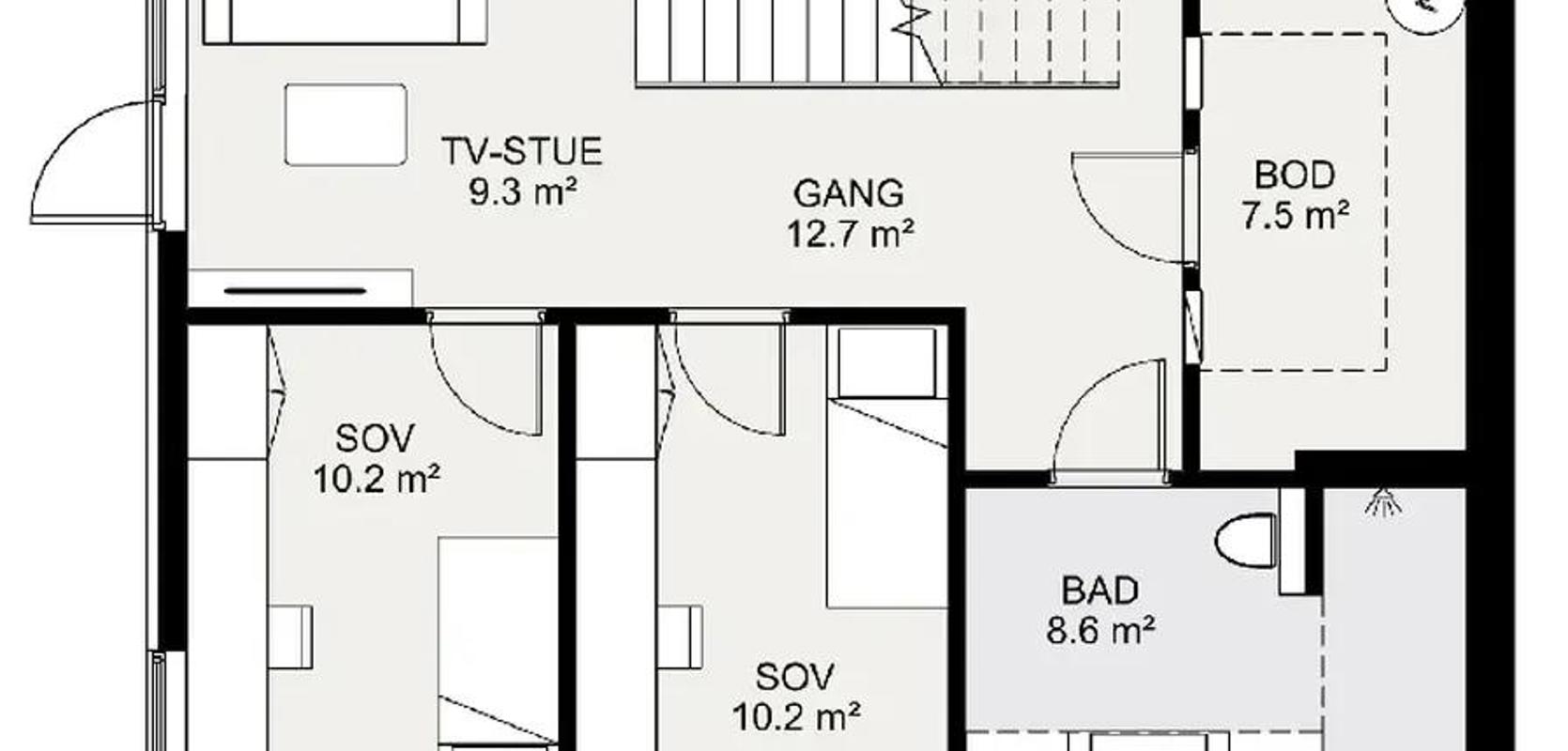 Den moderne trappen som fører deg til underetasjen er rett og stilren. Nede finner du to store soverom med god plass til både seng, garderobe og skrivebord, et romslig bad med ekstra stor dusj og en bod med gode lagringsmuligheter. TV-stuen har utgang til et overbygd uteområde, perfekt for å nyte sommerkvelder.