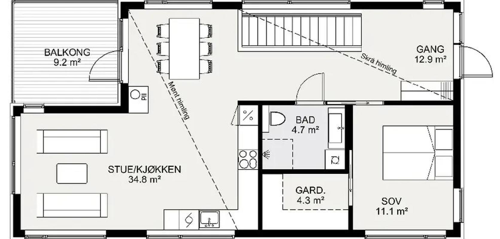 Du kommer inn i en entre med stor takhøyde. Saltaket gir en herlig romfølelse innover mot stue og kjøkken med en høyde på opptil fire meter. Store glasspartier slipper inn mye lys, samtidig som lange, smale vinduer og forskjøvede takflater gir huset et moderne uttrykk. I inngangsetasjen finner du også det store soverommet med tilhørende walk-in-closet og bad.