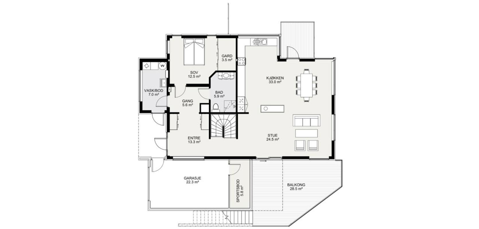 Uteplassene er like imponerende som interiøret. Fra kjøkken- og spiseavdelingen kan du enkelt stikke ut til den sjarmerende frokostbalkongen, eller slappe av på den store hjørneterrassen. En trapp fører deg videre opp til takterrassen over garasjen. Garasjen er perfekt integrert i huset, og har til og med en romslig sportsbod for praktisk oppbevaring av sykler, bildekk, ski og annet sportsutstyr.