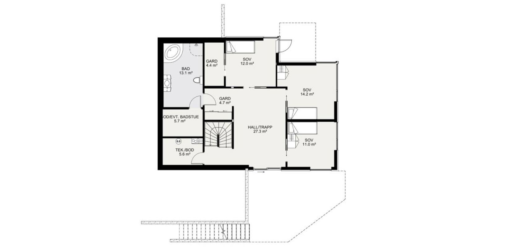 Inngangspartiet er strategisk plassert på øvre plan, noe som gjør huset tilgjengelig for alle livsfaser. Her vil du finne hovedsoverommet med en privat garderobe, eget bad i tilknytning til soverommet, et praktisk vaskerom med egen utgang, og et romslig kjøkken- og stueområde med en åpen planløsning. Den skrå himlingen og de store vinduene i det store oppholdsrommet gjør dette til et fantastisk rom.